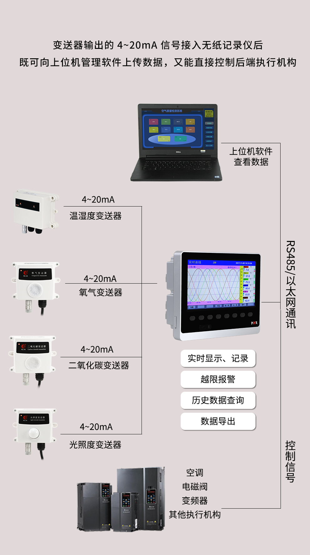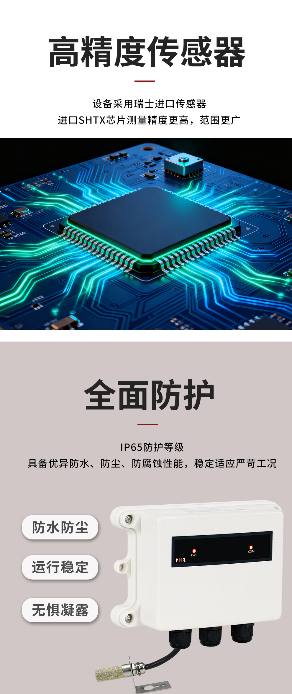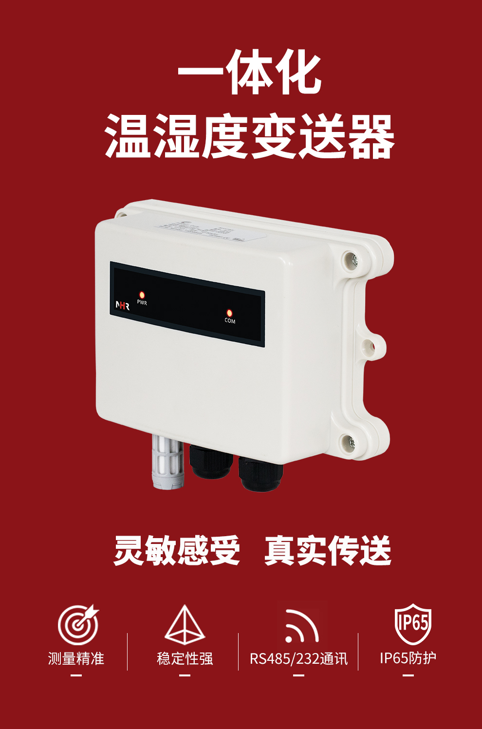 虹潤(rùn)公司是專業(yè)生產(chǎn)環(huán)境監(jiān)測(cè)儀表的國(guó)家專精特新“小巨人”企業(yè)。生產(chǎn)的一體式溫濕度變送器,具有溫度、濕度、露點(diǎn)高精準(zhǔn)的測(cè)量與變送,報(bào)警繼電器輸出,RS485/RS232通訊,IP65防護(hù)等級(jí)等特點(diǎn)。產(chǎn)品獲得一種手持式低功耗溫濕度檢測(cè)儀、大屏幕溫濕度記錄儀等2項(xiàng)國(guó)家發(fā)明專利,主持起草物聯(lián)網(wǎng)智能溫度儀表通用技術(shù)條件、冷鏈溫度記錄儀等2項(xiàng)國(guó)家標(biāo)準(zhǔn),以及通信系統(tǒng)多通道數(shù)據(jù)采集控制終端規(guī)范軍用標(biāo)準(zhǔn),以及現(xiàn)場(chǎng)設(shè)備集成等5項(xiàng)智能制造國(guó)家標(biāo)準(zhǔn),參與國(guó)際5G標(biāo)準(zhǔn)制定,取得溫濕度儀表等3項(xiàng)相關(guān)軟件著作權(quán)。產(chǎn)品廣泛應(yīng)用于工業(yè)現(xiàn)場(chǎng)、農(nóng)業(yè)大棚、倉(cāng)儲(chǔ)物流、地下管廊、養(yǎng)殖孵化、配電機(jī)房等諸多領(lǐng)域。