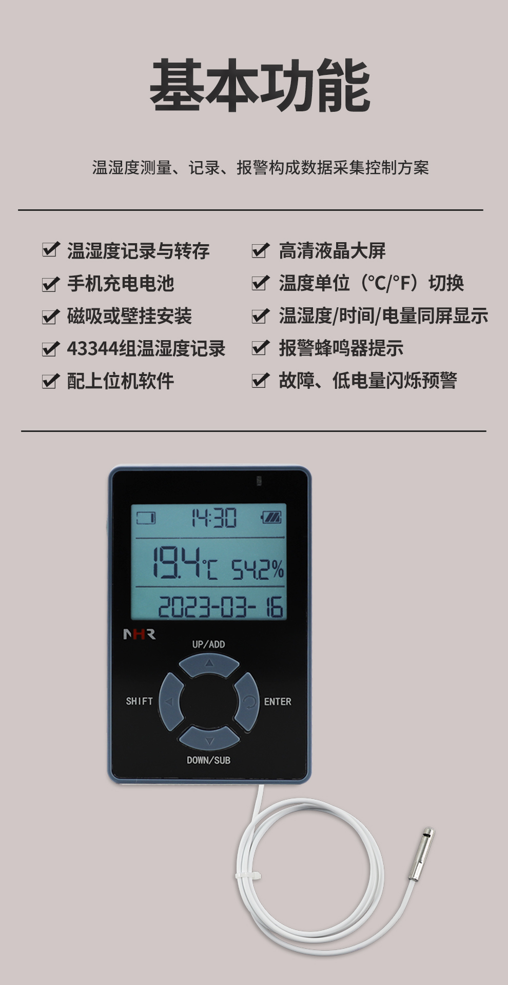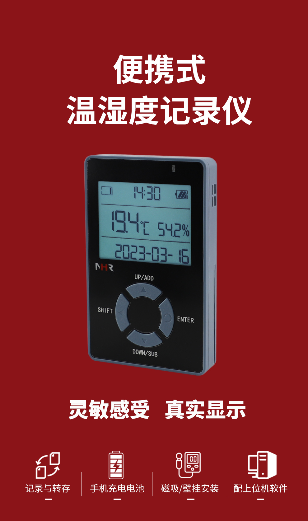 虹潤公司是專業(yè)生產(chǎn)環(huán)境監(jiān)測儀表的國家專精特新“小巨人”企業(yè)。生產(chǎn)的便攜式溫濕度記錄儀,具有溫濕度記錄與轉存,手機充電電池,磁吸或壁掛安裝,故障報警提示,配上位機軟件等特點。產(chǎn)品獲得一種手持式低功耗溫濕度檢測儀、無紙記錄儀等2項國家發(fā)明專利,主持起草物聯(lián)網(wǎng)智能溫度儀表通用技術條件、冷鏈溫度記錄儀等2項國家標準,通信系統(tǒng)多通道數(shù)據(jù)采集控制終端規(guī)范軍用標準,以及現(xiàn)場設備集成等5項智能制造國家標準,參與國際5G標準制定,取得便攜式溫濕度記錄儀等3項相關軟件著作權。產(chǎn)品廣泛應用于冷鏈運輸、醫(yī)藥冷庫、藥品陰涼柜、實驗室、機房倉庫、養(yǎng)殖孵化、大棚種植等諸多領域。