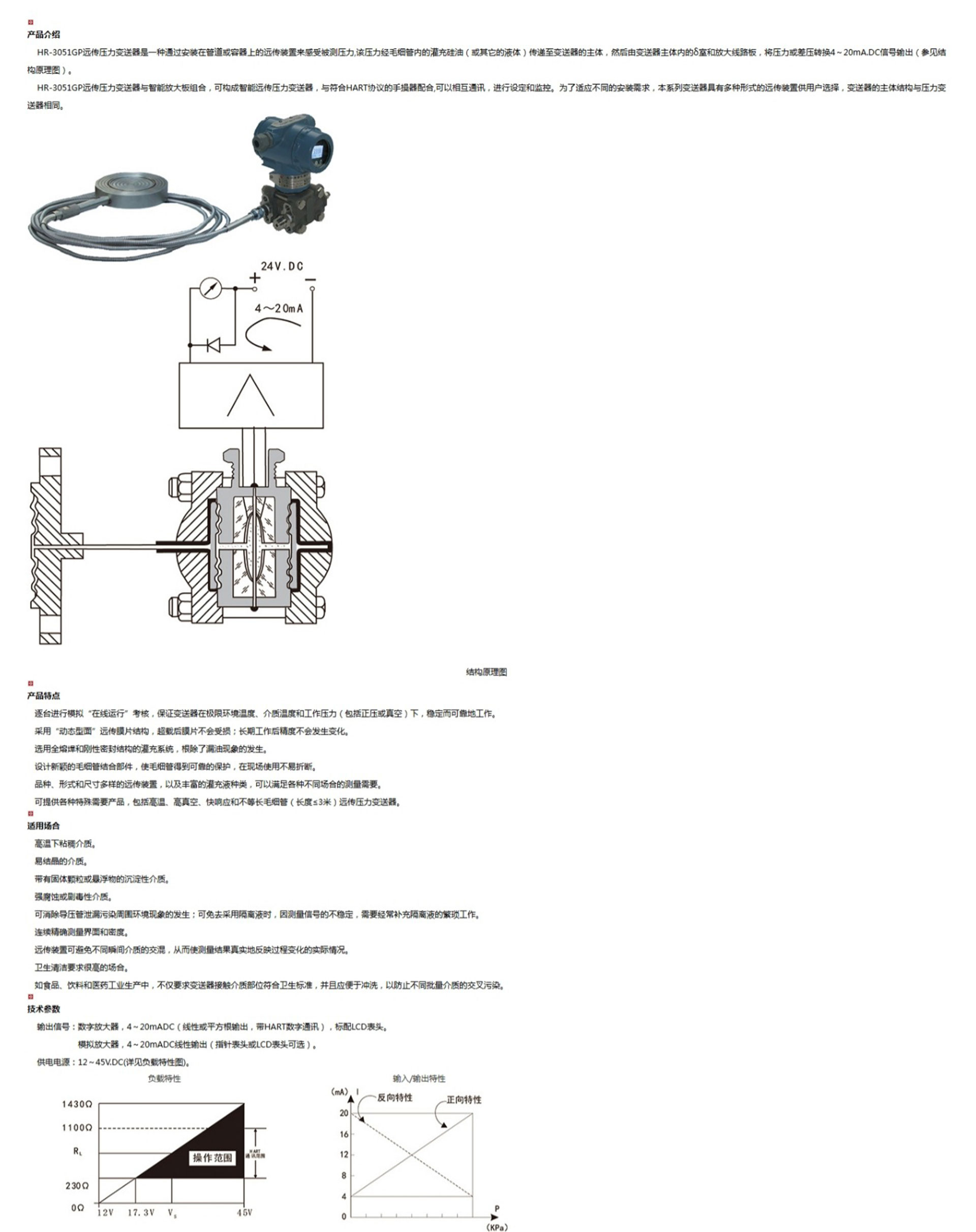 HR-3051GP遠傳壓力變送器是一種通過安裝在管道或容器上的遠傳裝置來感受被測壓力,該壓力經(jīng)毛細管內(nèi)的灌充硅油(或其它的液體)傳遞至變送器的主體,然后由變送器主體內(nèi)的δ室和放大線路板,將壓力或差壓轉換4~20mA.DC信號輸出。